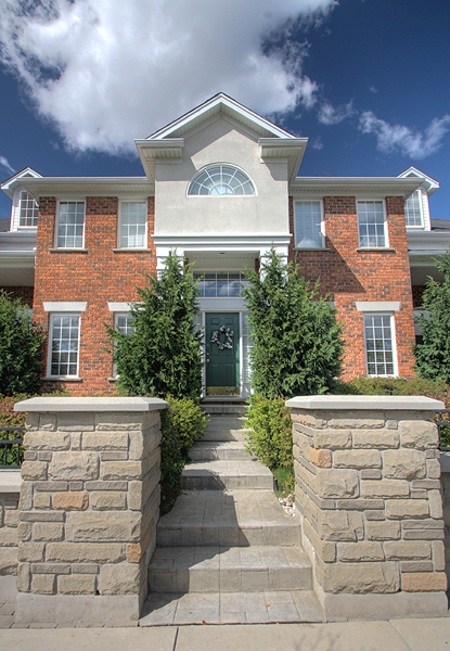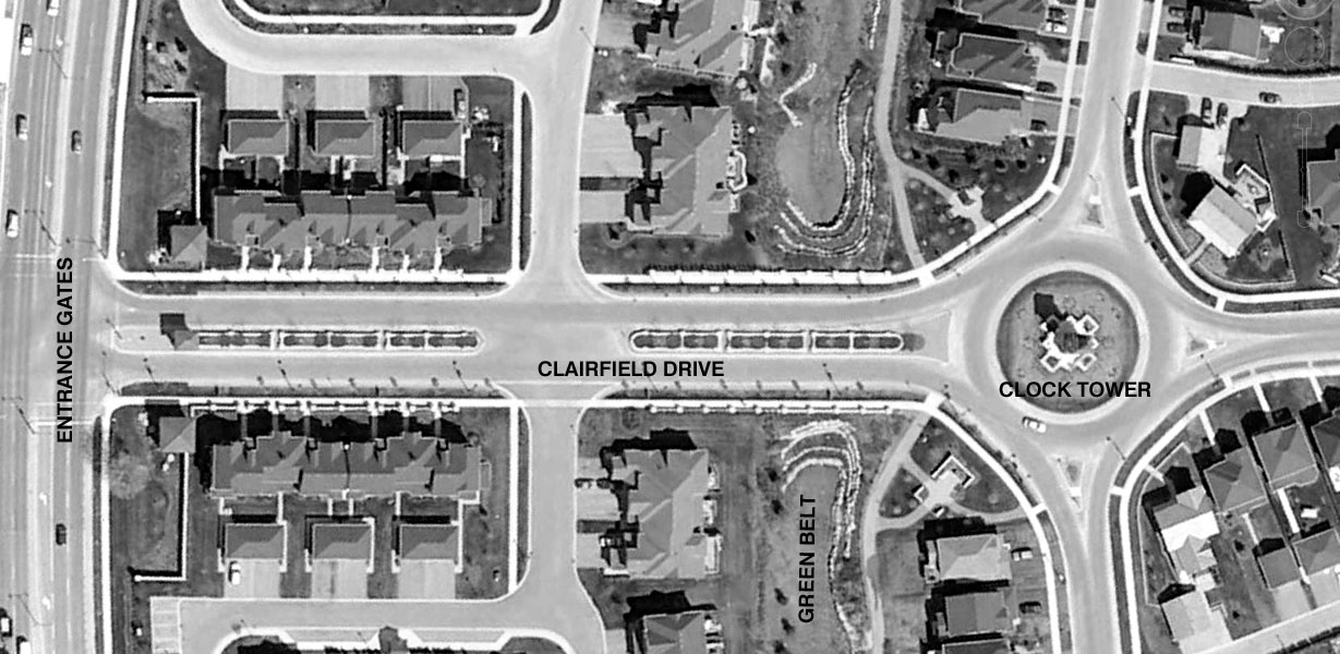 The urban space that this section of Clairfield Drive defines has been designed to serve as the grand entry to the master planned Westminster Woods community. As such it has several elements which work together to define a sense of entry, arrival and place. These characteristics are established through the arrangement of walls, porticos, walkways, yards, garden walls and boulevard planters which define the transition from the civic realm to private dwelling. The walls of the townhomes being nearly continuous and relatively close to the street form the edge of an urban room. Further, the main entry off of Gordon Street is anchored by three pavilions partially linked together with high garden walls. These structures frame the vista along Clairfield to the clock tower where the vista terminates. The urban space defined by all of these elements working together creates the grand entry to Westminster Woods.