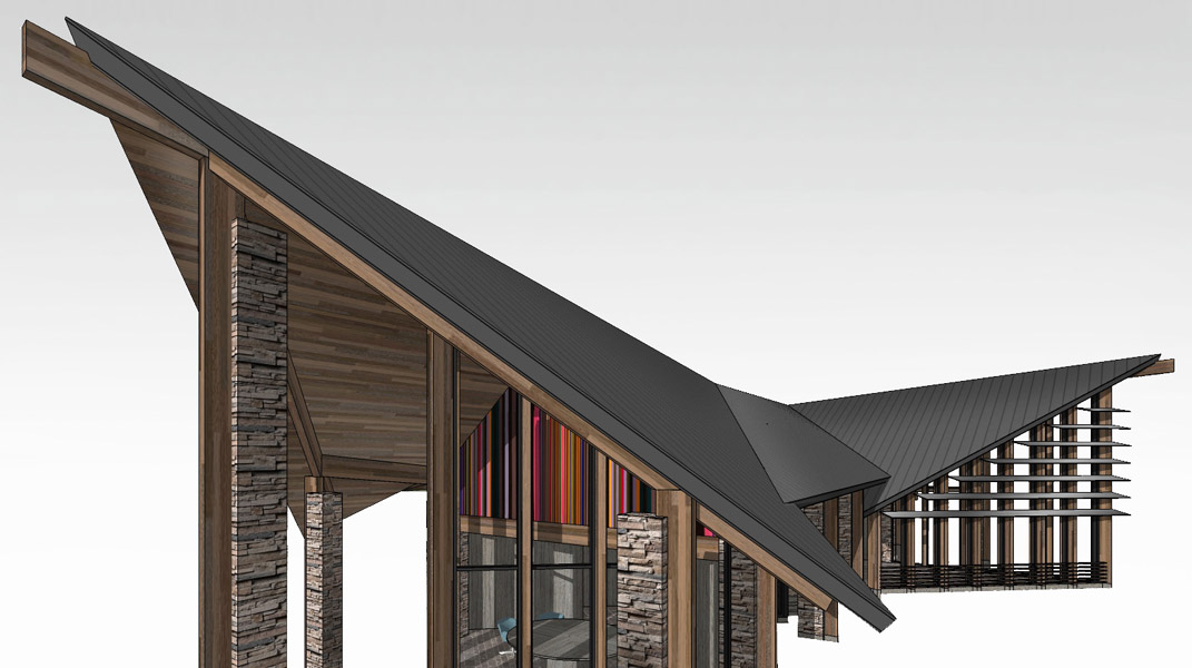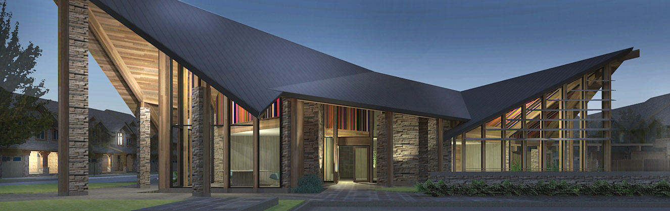 This small community centre packs several features on a small site within a condominium townhouse community. Pool, sundeck, splash pad, playground, hot tub, exercise room, lobby, meeting room, change rooms and sauna integrate to create an effective architectural focus for the neighborhood. The expansive glass of the building creates the sensation of openness so that outdoor and indoor spaces become visually connected and enhance the sense of community. The high angled roof and the colour field murals, visible through the high glass walls, create a vibrant counterpoint to the domestic vernacular of the surrounding homes. During the dark winter months the illuminated interior spaces will be visible through the tall glass windows and light the streetscape like large-scale lanterns.